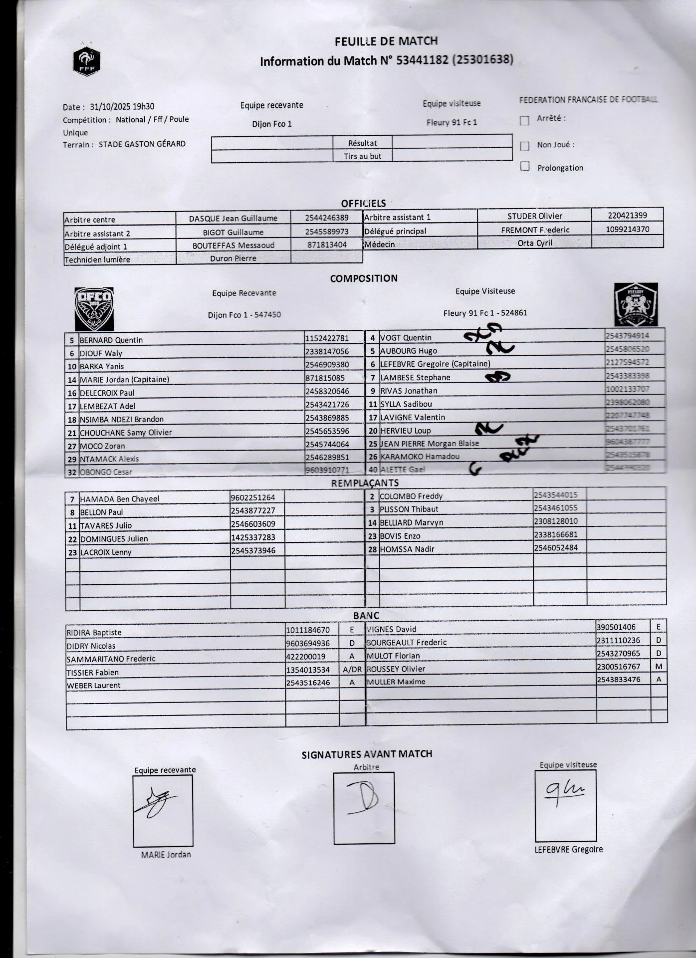| 21/10 | Versailles-Dijon | 0-2 | Oui | 2 | XXXX | XXXX | Oui | Oui | Oui | ||